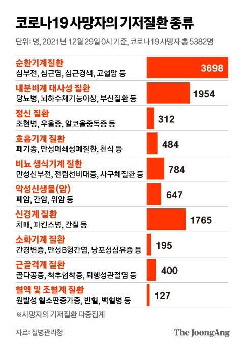 지난해 12월 29일 0시 기준 국내 코로나19 누적 사망자 5382명의 기저질환 종류를 가려낸 것이다.