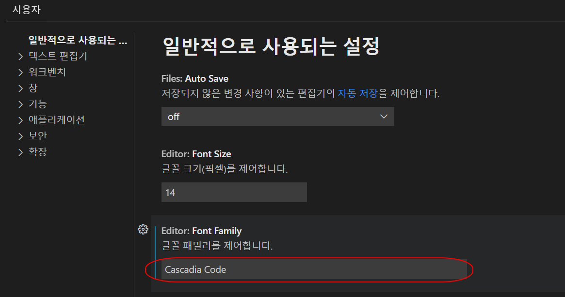 폰트를 윈도우의 글꼴 fonts 폴더에 ttf 파일들을 복사한 다음, Visual studio Code 에서도 폰트를 사용할 수 있습니다. 저는 그 중에 보편적인 Cascadia Code 를 지정하였습니다.
