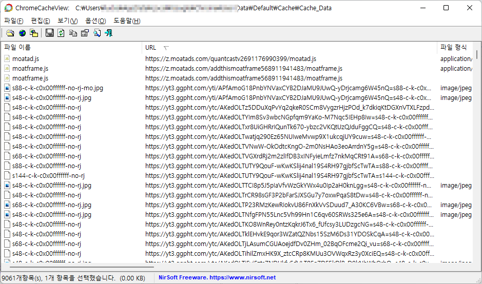 한글팩 (ChromeCacheView_lng.ini) 이 있어서 별개로 다운로드 받아 위에 유틸 파일 받은 폴더 내부에 넣으시면 되겠습니다.