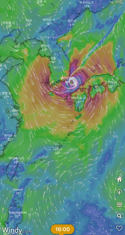 Windy 에서는 다음주 화, 수요일(6일, 7일) 쯤 부산광역시와 일본 사이로 예측하고 있습니다.
