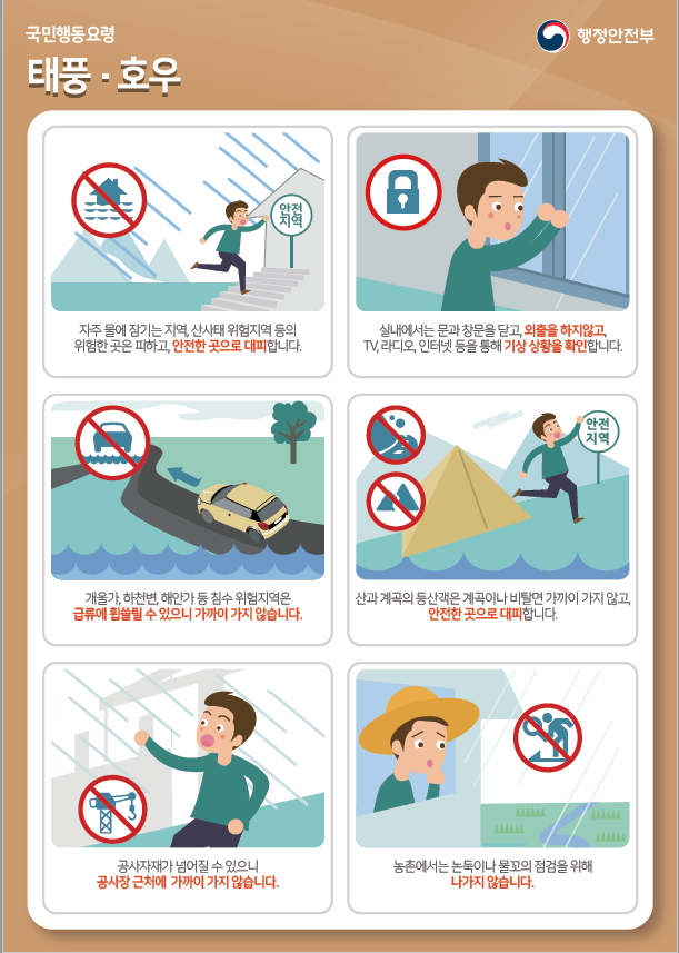 ▲ 자주 물에 잠기는 지역, 산사태 위험지역 등의 위험한 곳은 피하고 안전한 곳으로 대피합니다. ▲ 실내에서는 문과 창문을 닫고, 외출을 하지 않고 TV, 라디오, 인터넷 등을 통해 기상상황을 확인합니다. ▲ 개울가, 하천변, 해안가 등 침수 위험지역은 급류에 휩쓸릴 수 있으니 가까이 가지 않습니다. ▲ 산과 계곡의 등산객은 계곡이나 비탈면 가까이 가지 않고 안전한 곳으로 대피합니다. ▲ 공사자재가 넘어질 수 있으니 공사장 근처에 가까이 가지 않습니다. ▲ 농촌에서는 논둑이나 물꼬의 점검을 위해 나가지 않습니다.
