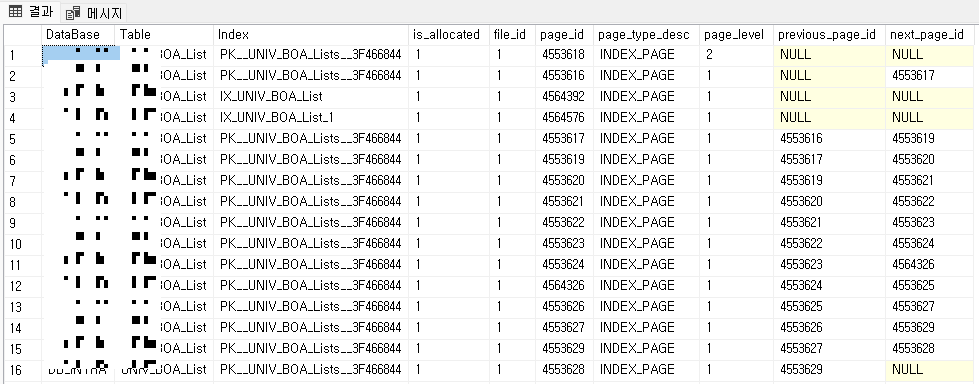 인덱스 REBUILD 작업이 완료된 이후에는 새로운 page_id의 페이지가 생성되어 있는 것을 확인할 수 있습니다. 이렇게 인덱스 REBUILD 는 인덱스를 완전히 삭제하고 새로 구성하게 됩니다.