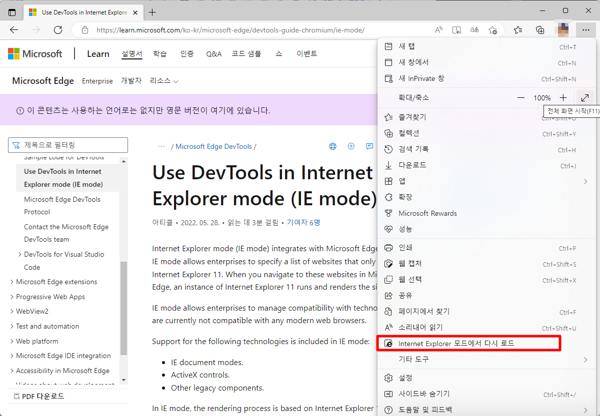 Internet Explorer 모드(IE 모드)는 Microsoft Edge DevTools와 통합됩니다. IE 모드를 사용하면 기업에서 Internet Explorer 11에서만 작동하는 웹 사이트 목록을 지정할 수 있습니다. Microsoft Edge에서 이러한 웹 사이트로 이동하면 Internet Explorer 11의 인스턴스가 실행되고 탭에서 사이트를 렌더링합니다.