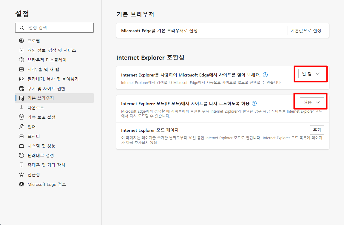 "기본 브라우저" 중 internet explorer 호환성 메뉴 중,
