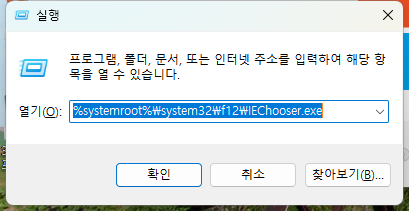 실행 화면에서 %systemroot%\system32\f12\IEChooser.exe 를 입력하고 "확인" 버튼을 누릅니다.