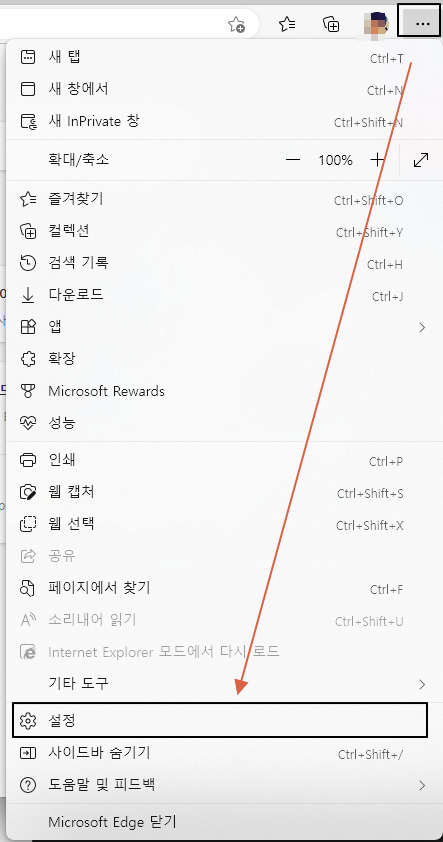먼저 이를 사용하기 위해서 edge 브라우저의 "..." 를 눌러 "설정" 서브 메뉴를 선택합니다.