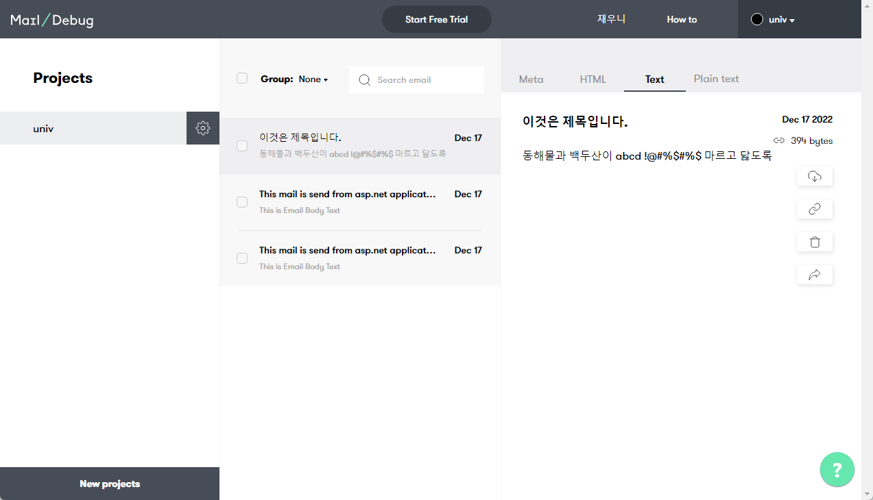 가짜 SMTP 서버 중에 이를 무료로 서비스해 주는 debugmail.io 사이트에 회원가입하여 사용해 보도록 하겠습니다.