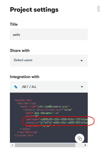 https://debugmail.io/ 를 가입하고 나서, 프로젝트를 만들게 되면, settings 서브메뉴를 보시게 됩니다. 이를 선택하면 아이이디와 비밀번호를 제공해 줍니다.