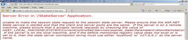 위의 그림과 같이 클라이언트가 웹 서버에 요청을 보내면 웹 서버는 세션 데이터를 StateServer 에 저장합니다. StateServer는 현재 시스템이거나 다른 시스템일 수 있습니다. 그러나 IIS와는 완전히 독립적입니다. StateServer의 대상은 web.config stateConnectionString 설정에 따라 달라집니다. 127.0.0.1:42424로 설정하면 로컬 시스템 자체에 데이터가 저장됩니다. StateServer 대상을 변경하려면 IP를 변경하고 aspnet_state.exe가 해당 시스템에서 실행 중인지 확인해야 합니다. 그렇지 않으면 세션에 데이터를 저장하려고 시도하는 동안 다음 예외가 발생합니다.