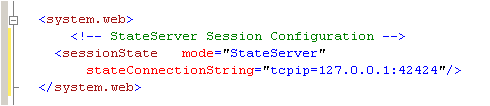 이제 StateServer 설정에 대한 web.config 구성을 살펴보죠. State Server 설정에 대해서 stateConnectionString 을 기술해야 합니다. 이는 ASP.NET State Server 를 실행 중인 시스템을 식별합니다. 기본적으로 stateConnectionString 은 IP 127.0.0.1(localhost) 및 포트 42424를 사용했습니다.