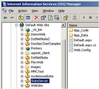 이제 IIS를 열면 웹 응용 프로그램의 이름으로 생성된 가상 디렉터리를 볼 수 있습니다. 제 경우에는 StateServer입니다.