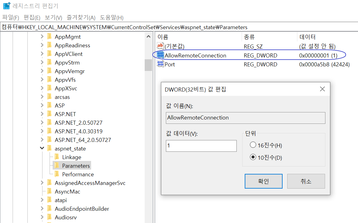 \HKEY_LOCAL_MACHINE\SYSTEM\CurrentControlSet\Services\aspnet_state\Parameters 위치에서 AllowRemoteConnection 의 기본값(0) 을 1로 치환합니다. 이는 원격지 연결을 허용해 주는것을 의미합니다. 외부 웹서버로 부터 StateServer 를 사용하고자 할 경우, 연결자를 통해 접근 시 원격지 연결 허용을 해서 사용할수 있도록 해줍니다.