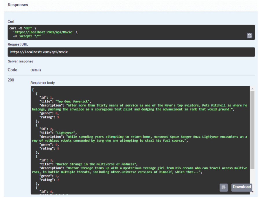 핸들러는 데이터베이스에 대해 async query 를 작성하고 모든 Movies 항목을 목록에 저장합니다. 목록의 각 Movie 항목에 대해 Movie 항목을 Movie dto에 매핑하고 해당 Movie dto 를 목록에 추가한 다음 반환합니다. 컨트롤러에서 데이터베이스의 모든 영화를 요청하기 위한 endpoint 를 추가합니다.
