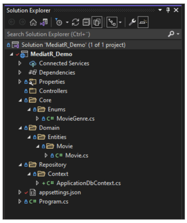 Context 라는 하위 폴더가 있는 부분에서 Repository 라는 폴더를 만듭니다. Context 폴더 안에 ApplicationDbContex.cs라는 새 파일을 추가해야 합니다. ApplicationDbContext.cs는 데이터베이스에서 처리하기 위해 Movie Model 을 포함해야 합니다.