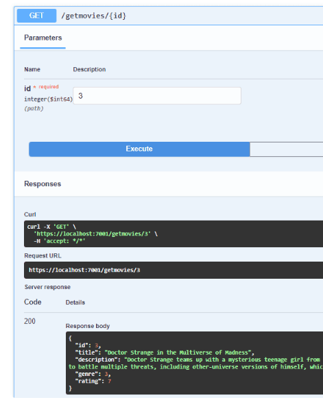 이 경우 요청 서비스에서 보낸 특정 ID를 가진 Movie 가 없으면 null을 반환하는 핸들러를 구현했습니다. 보시다시피 EF Core를 사용하여 id가 GetMovieQuery request-id 의 id와 동일한 Movie 을 가져옵니다. 컨트롤러 내부에 특정 라우팅이 있는 endpoint 을 추가합니다.