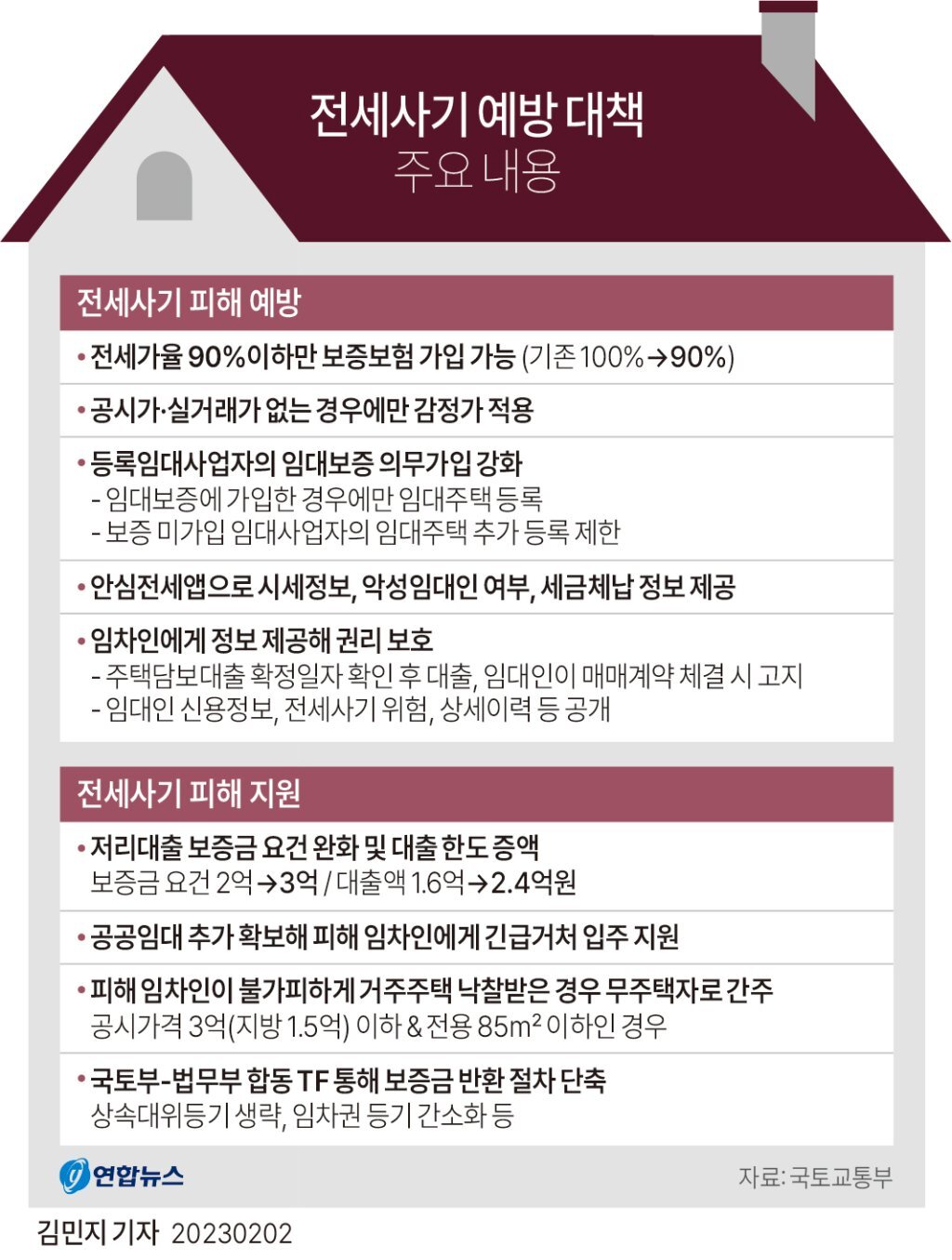 국토부 관계자는 "전세가율 90~100%인 주택에서 대다수 전세사기가 발생해 보증보험 가입 대상을 90% 이하로 결정했다"며 "전세사기 대책에서 이미 계약을 체결한 임차인 보호를 위해 5월까지 유예기간을 부여했다. 또 기존 보증갱신 대상자에 대해서는 2024년 1월부터 적용 시행하는 유예기간을 뒀다"고 말했다.