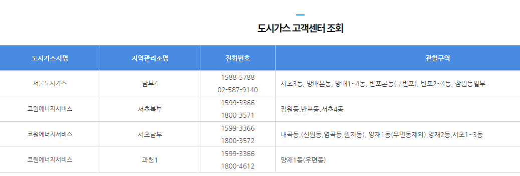 서울 서초구를 검색하니 도시가스 고객센터 전화번호 4군데 나오네요. 관할구역에 맞게 연락하셔서 문의하시면 됩니다.