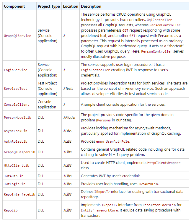 소스를 전체적으로 받으면, 웹어플리이션 2개와 어플 1개, 테스터 1개 그리고 나머지는 라이브러리 입니다. 각각의 역할에 대해 아래 설명이 되어 있습니다. LoginService 가 인증부분을 담당하며, GraphQlService 은 GraphQl 구문을 분석하여 반환해 주는 웹서비스로 보시면 되겠습니다. ConsoleClient 은 콘솔 command 를 통해 GraphQl 을 활용하여 데이터를 얻는 가이드를 설명해 줍니다.