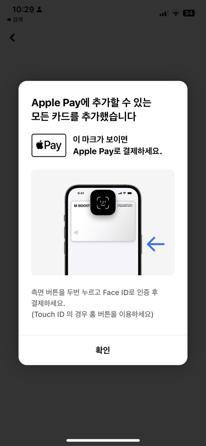아이폰에서 현대카드 앱을 열면 애플페이 등록하도록 가이드를 제공해 줍니다. 등록 한 후에는 우측 하단 측면 기기에 있는 버튼을 2번 누르고 face id 인증을 하면 결제 가능하다고 합니다.
