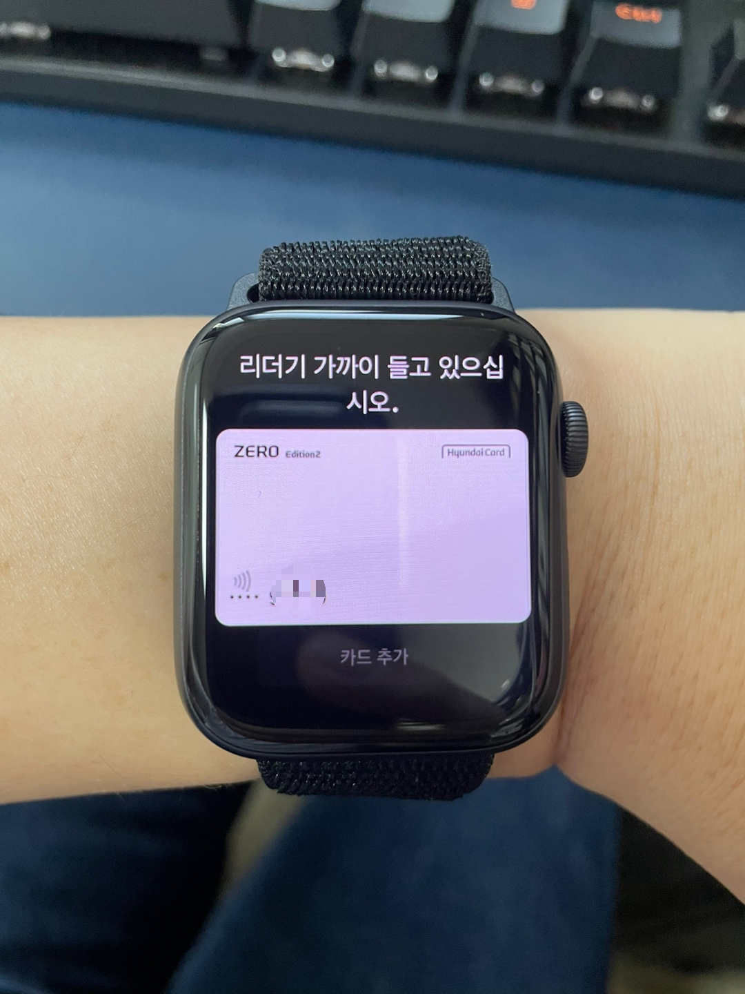 이중 클릭하여 결제하기 라는 표기대로, 워치 우측 하단 기기 측면에 버튼이 있습니다. 2번 버튼을 누릅니다.