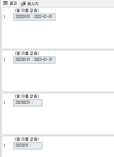 함수에서는 먼저 TRY_CAST 함수를 사용하여 입력값을 DATE형으로 변환한 뒤, FORMAT 함수를 사용하여 'yyyy-MM-dd' 형식으로 출력합니다. 이후, TRY_CONVERT 함수를 사용하여 변환된 값이 120 포맷(YYYY-MM-DD)에 맞는지 확인하고, 맞지 않을 경우 NULL 값을 반환하며, 통일하기 위해 NULL 체크 한 후 '' 빈값으로 변환하여 반환하였습니다.