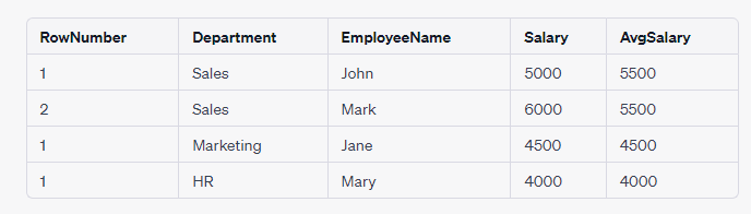 Employees 테이블에서 데이터를 조회하고, 각 부서별로 ROW_NUMBER() 열을 할당하여 순차적인 번호를 부여합니다. PARTITION BY Department로 부서별로 그룹화되며, ORDER BY EmployeeName을 사용하여 직원 이름을 기준으로 정렬합니다. Department 열은 부서 이름을, EmployeeName 열은 직원 이름을, Salary 열은 직원의 연봉을 나타냅니다. AvgSalary 열은 AVG(Salary) OVER (PARTITION BY Department) 구문에 따라 각 부서별 평균 연봉을 계산합니다.