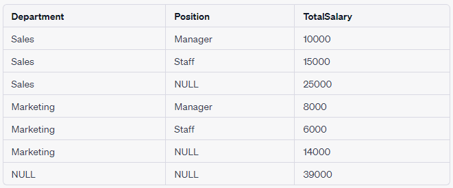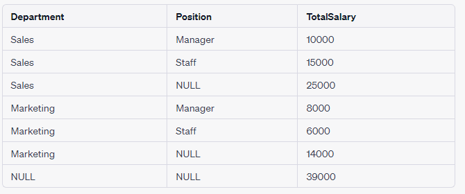 위의 예시에서는 Employees 테이블에서 부서별, 직급별로 급여의 합계를 계산합니다. ROLLUP (Department, Position) 구문을 사용하여 계층적인 그룹화를 수행하며, 각 부서와 직급의 조합에 따른 부분 합계와 총합계가 반환됩니다. 아래는 예시 결과의 표 형태입니다.