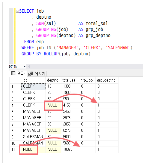 HAVING GROUPING(job) = 1 OR GROUPING(deptno) = 0