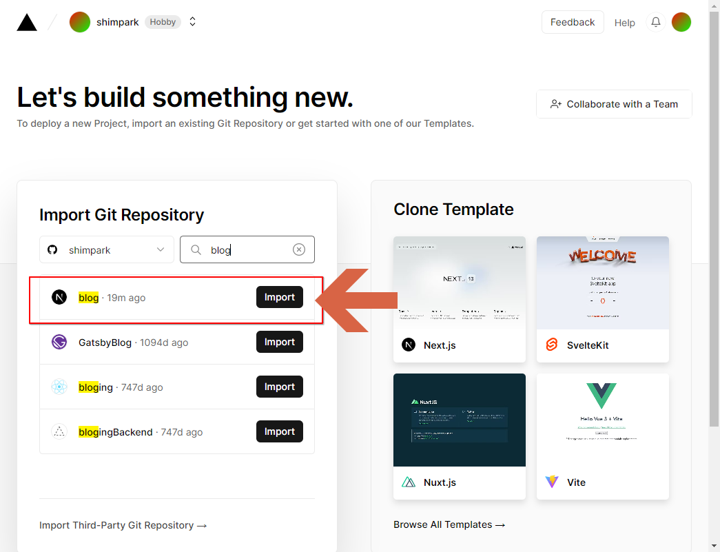 github 에서 만든 blog 라는 repository 이름을 검색합니다. 조회되면 import 버튼 선택합니다.