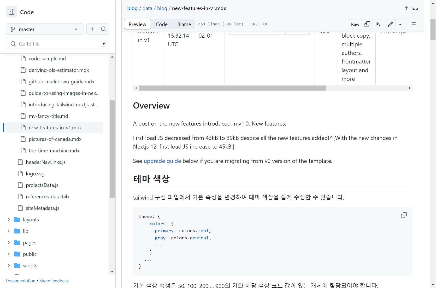 github 의 blog 소스코드 수정을 위해 blog /data / blog / new-features-in-v1.mdx 를 조회합니다. 여기서 에디터 수정을 통해 문구 몇가지를 수정했습니다. 그리고 저장 버튼을 누르면 github 에 commit 이 됩니다.