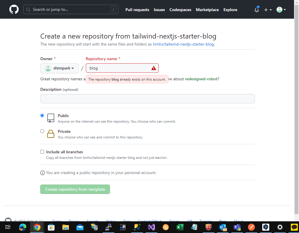 Repository name 은 원하는 이름을 기재합니다. 여기서는 blog 로 기재하고 public 상태에서 저장하였습니다.