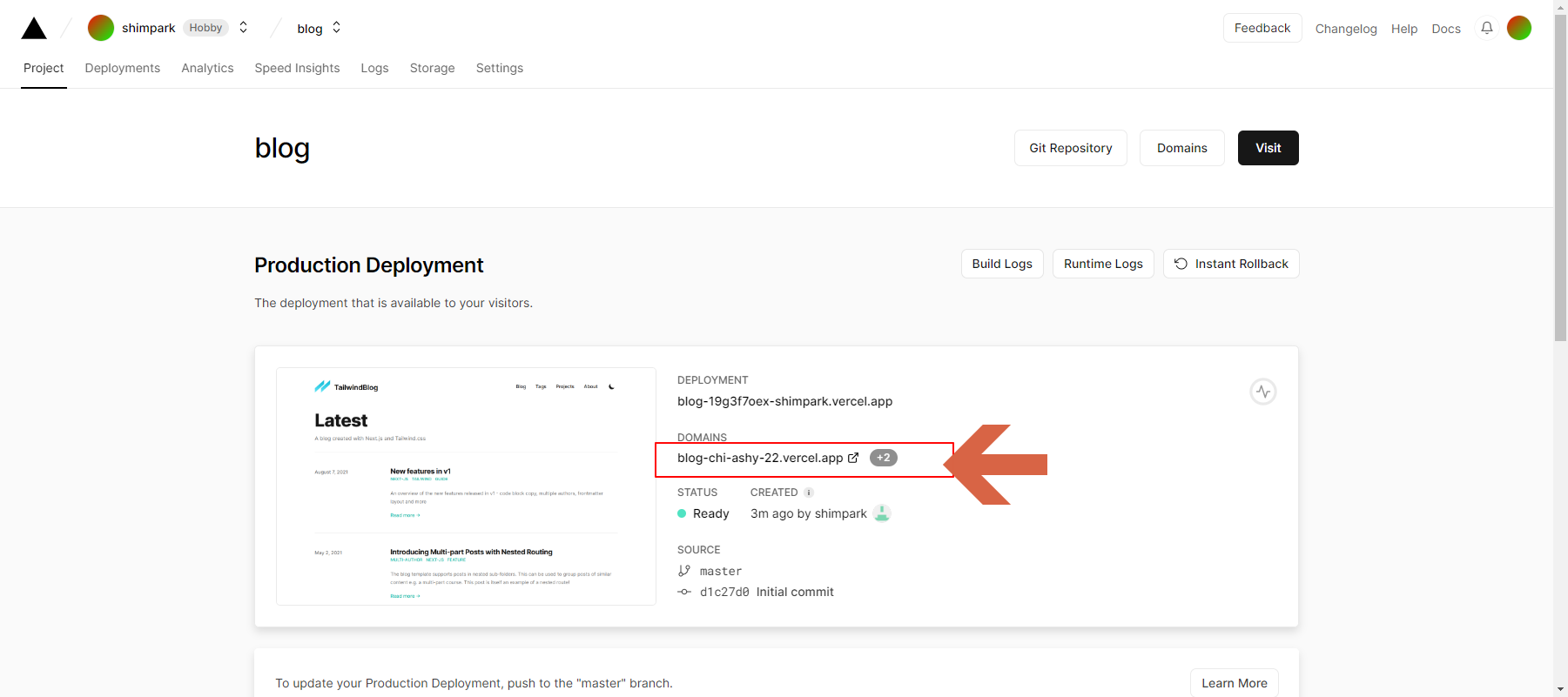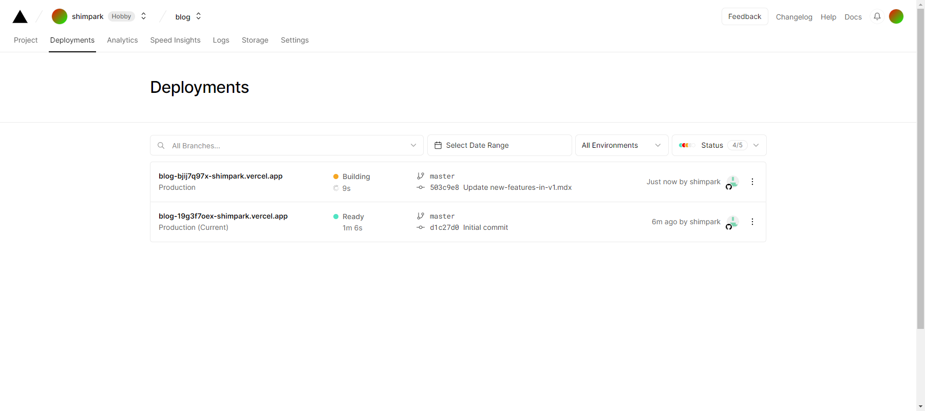 commit 된 소스 내용은 바로, Vercel 에 자동 배포가 됩니다. 해당 Vercel 화면에 가면 Building.. 이라고 표기되면서 재빌드를 하는 것을 보실 수 있습니다. 해당 부분이 완료되면 production 에서 production (Cureent) 라고 변경되면서 최종 변경된 버전으로 blog내용을 보실 수 있습니다. (배포 시 이 또한 오래 걸림 ☕☕☕☕)
