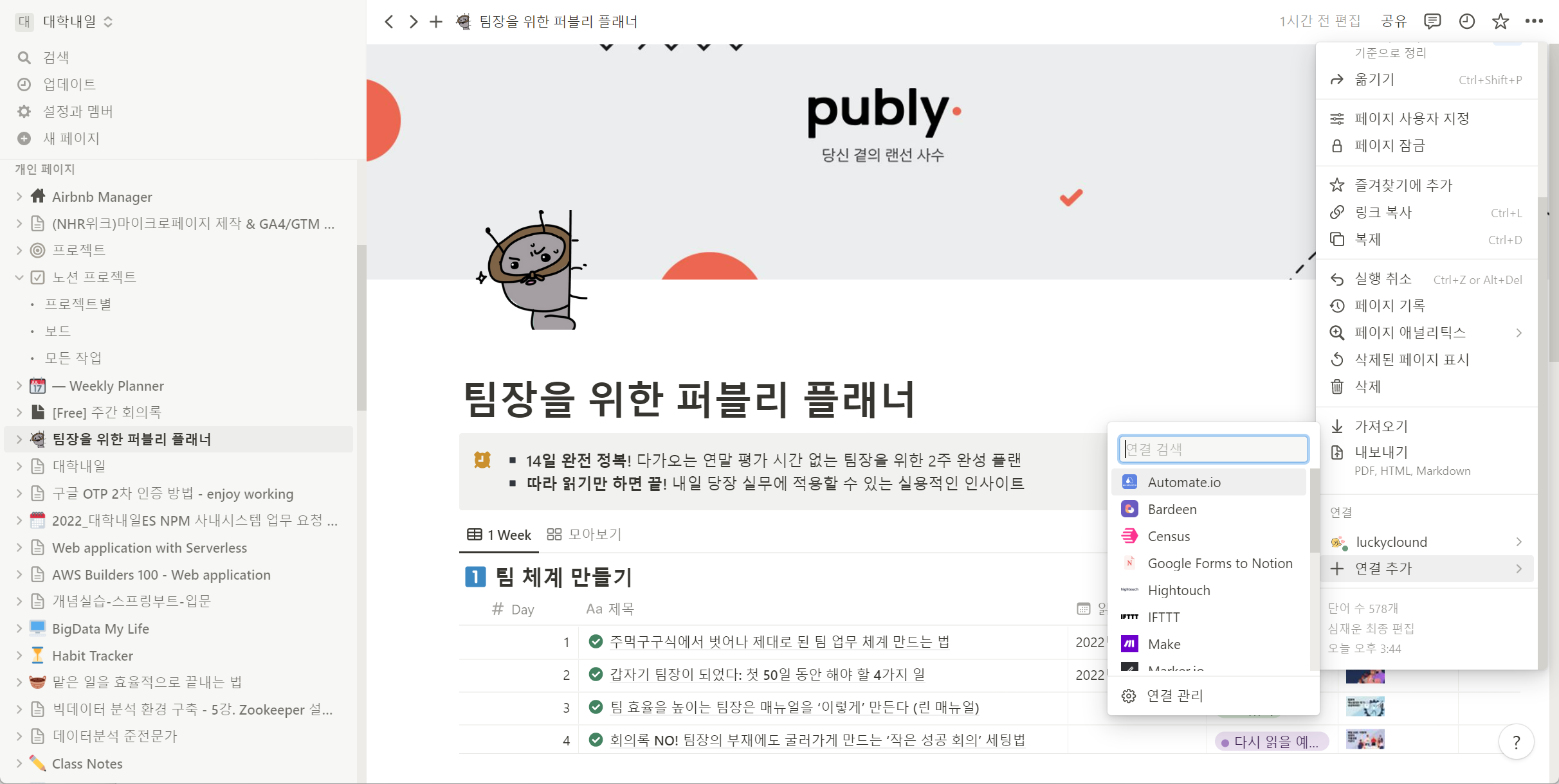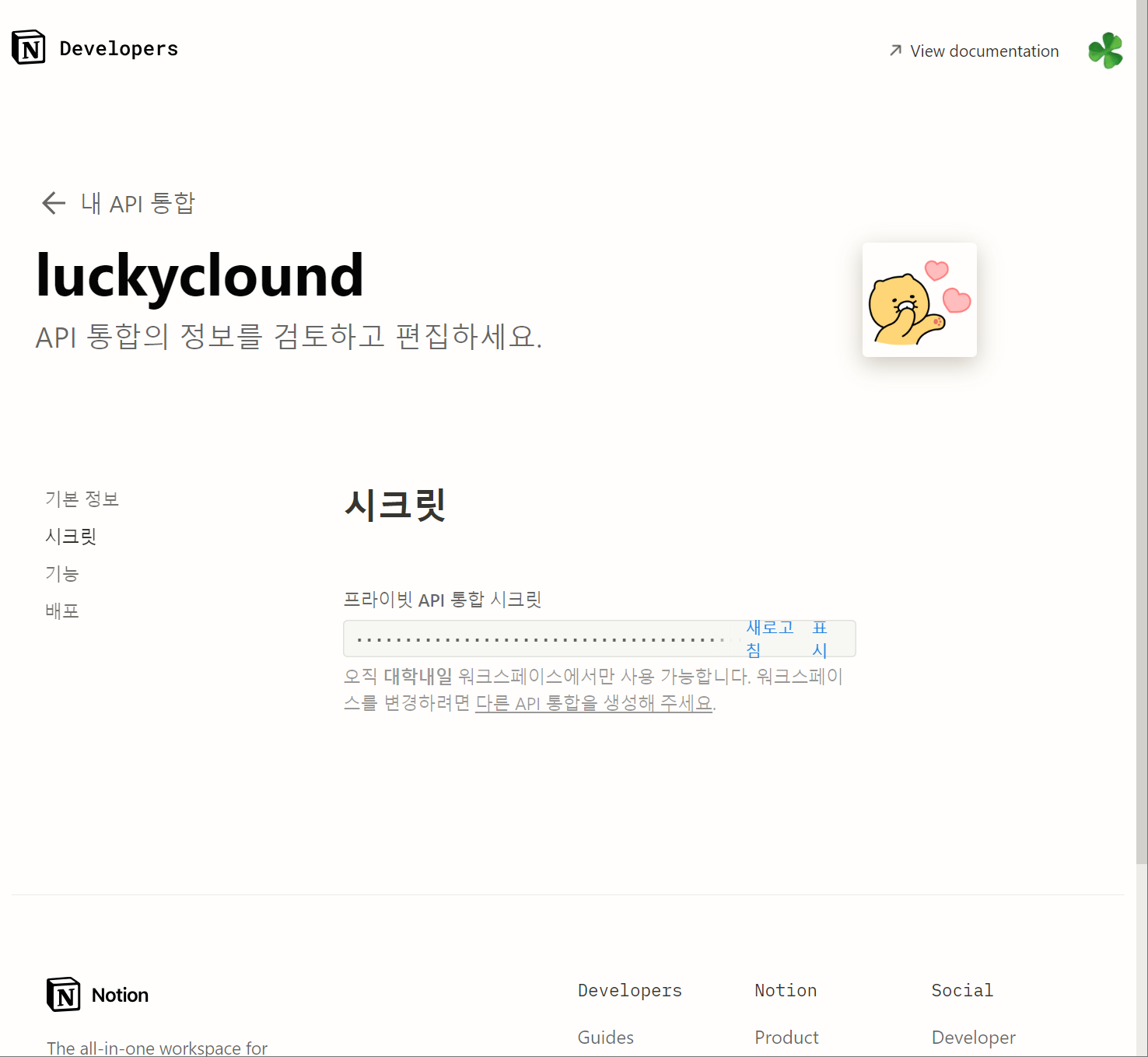 생성한 api 통합계정을 통해, 원하는 노션에 연결을 해줍니다. 만들어 준, luckycloud 라는 것을 연결합니다.
