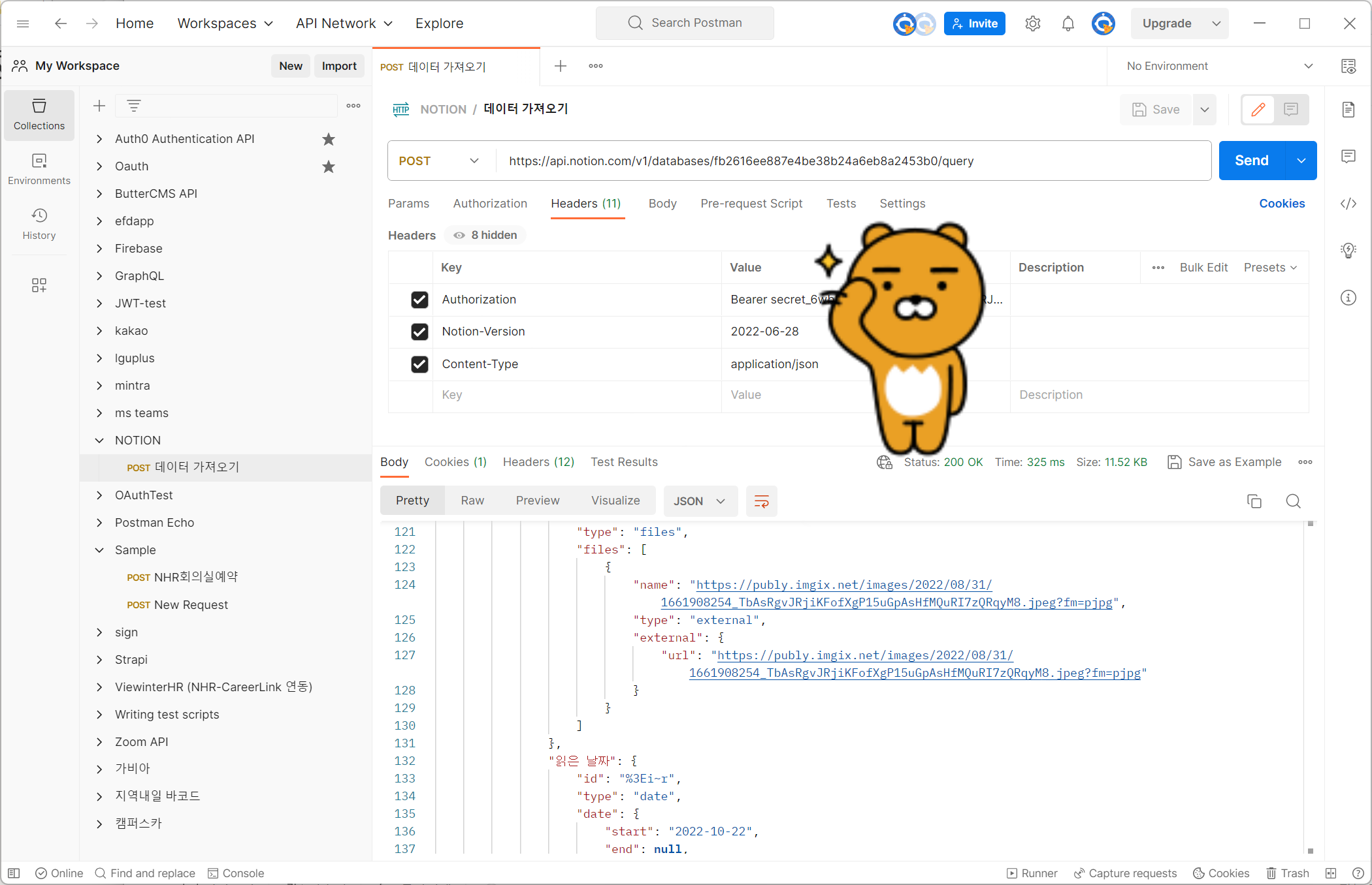POST 이며, databases/{{아이디}}/query 라는 형태를 가지고 있고, header 로 파라미터를 3개 정도 전송한다. bearer 인증 값, 노션 최신버전 날짜, 전송형식은 json 을 의미합니다.