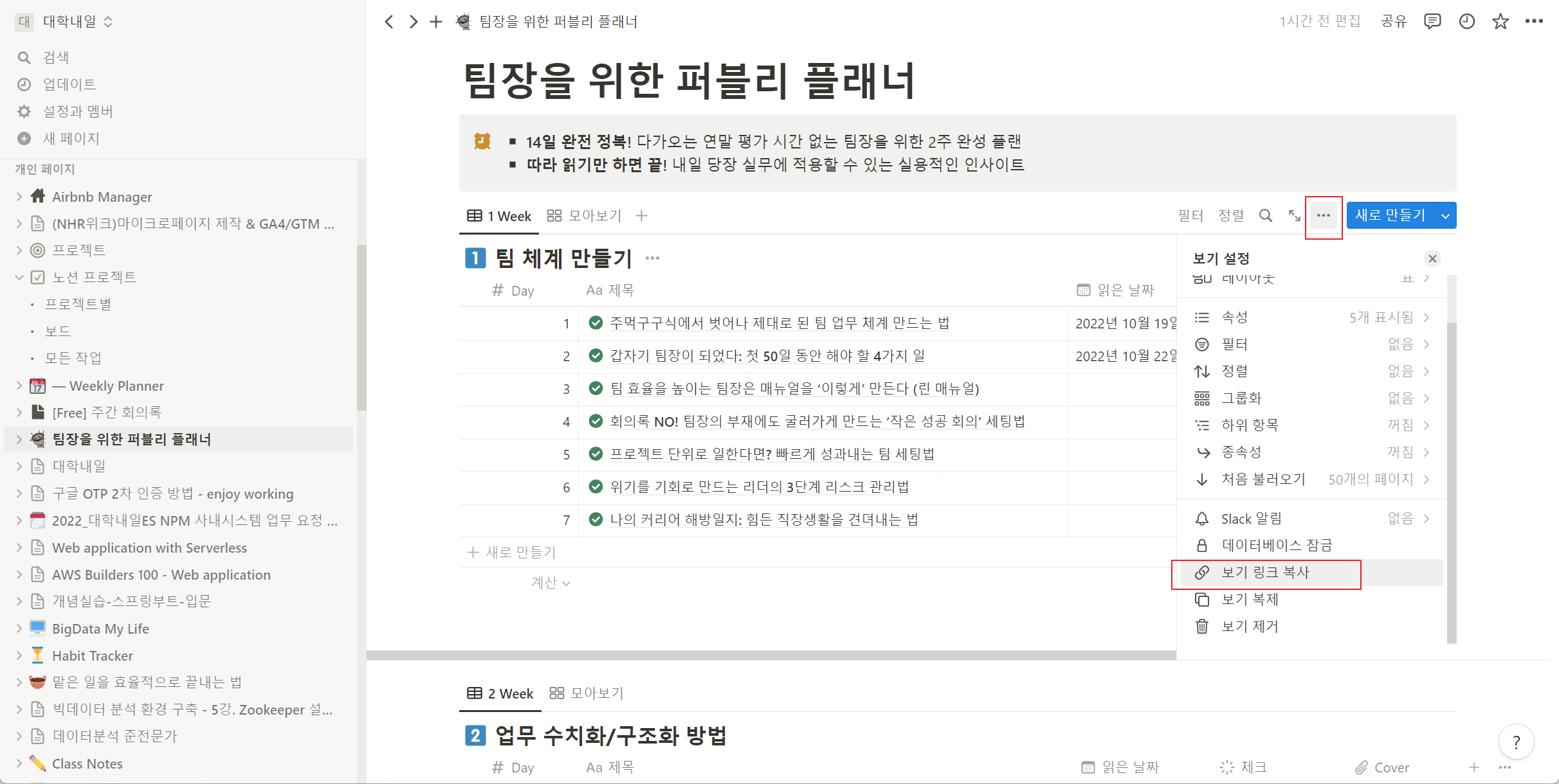 원하는 테이블의 "보기 링크 복사" 를 통해 주소를 얻습니다.