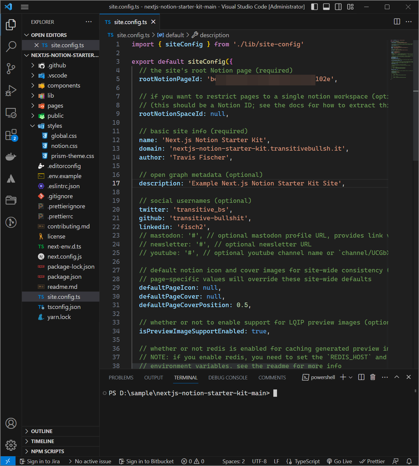와 같은 형태를 지닌 사이트 주소를 얻게 되면, 이는 웹사이트 화면에 보여줄 노션의 페이지 아이디가 바로 붉은색으로 표기된 주소입니다. site.config.ts 에서 수정해 주면 완료된 사항입니다.