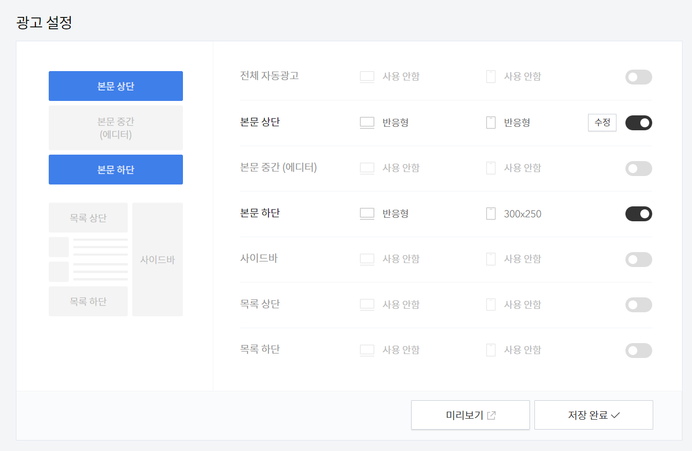 6월 27일 이후부터 티스토리에서 자체 광고를 신설하여, 저희가 운영하는 블로그 본문 상단과 하단 중 한 곳에 노출이 된다고 합니다.