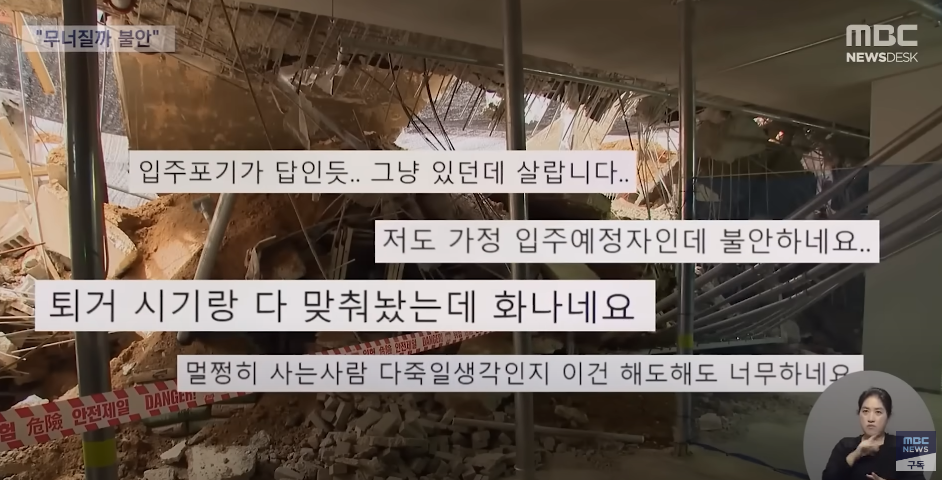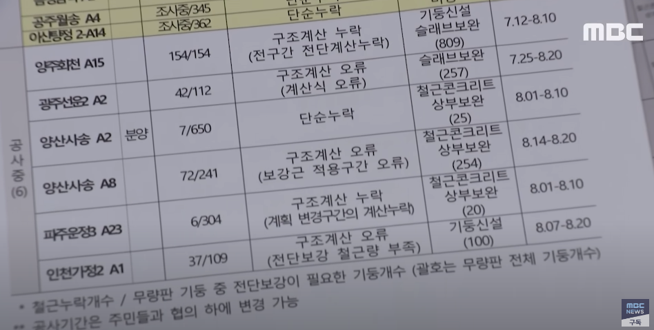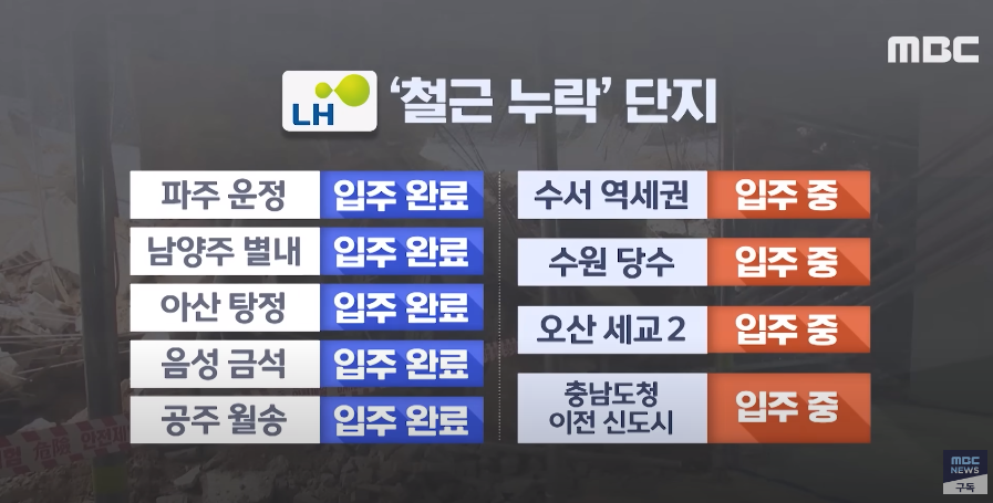한국토지주택공사(LH·엘에이치)에서 발주한 아파트 지하주차장(무량판 구조) 15곳에서 ‘철근 누락’이 확인된 가운데 입주민들이 계속해서 불안감을 호소하고 있다.파주 운정 엘에이치 아파트(초롱꽃마을 3단지) 주민 문진규씨는 2일 와이티엔(YTN) 라디오 프로그램 ‘뉴스킹 박지훈입니다’ 인터뷰에서 “여기서 계속 살아야겠나 싶은 생각도 든다”며 “말 그대로 지진이 나서 갈라지거나 하면 무조건 무너질 게 뻔한 것이고, 그런 상태로 있으니 입주민은 정말 불안하다”고 했다. 문씨가 사는 아파트 지하주차장은 철근 12개가 빠졌다고 알려진 곳 입니다. 입주민 모른 채 보강공사를 하고 있었다는 게 드러나서 논란 중이기도 합니다.