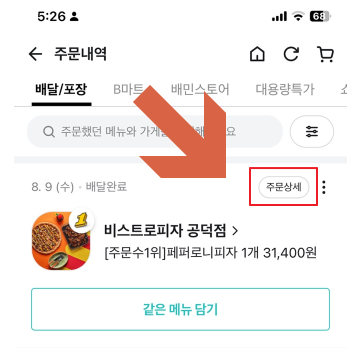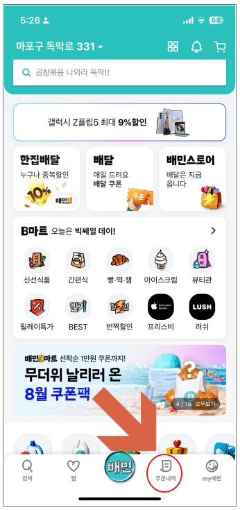 메인화면에서 하단에 "주문내역" 을 선택합니다.