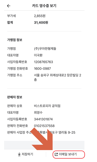 화면 제일 하단에 내려보면, "저장하기", "이메일보내기" 가 있습니다. 스마트폰 이미지로 영수증을 저장할 경우 "저장하기" 버튼을 사용하며, PC 환경이나 다른 분들에게 메일로 전달할 경우, "이메일 보내기" 버튼사용하며 좋습니다.