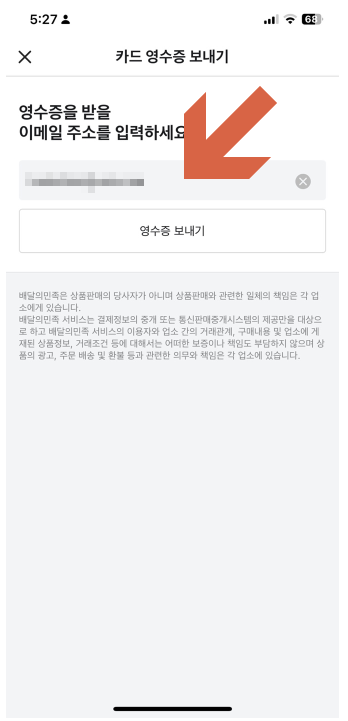 "이메일보내기" 화면에서 이메일 주소를 입력한 후, "영수증보내기" 버튼을 선택 합니다.
