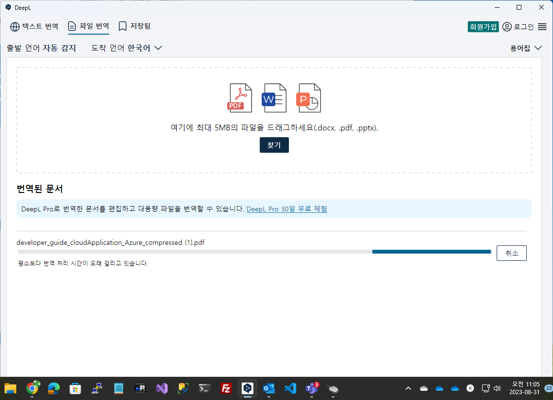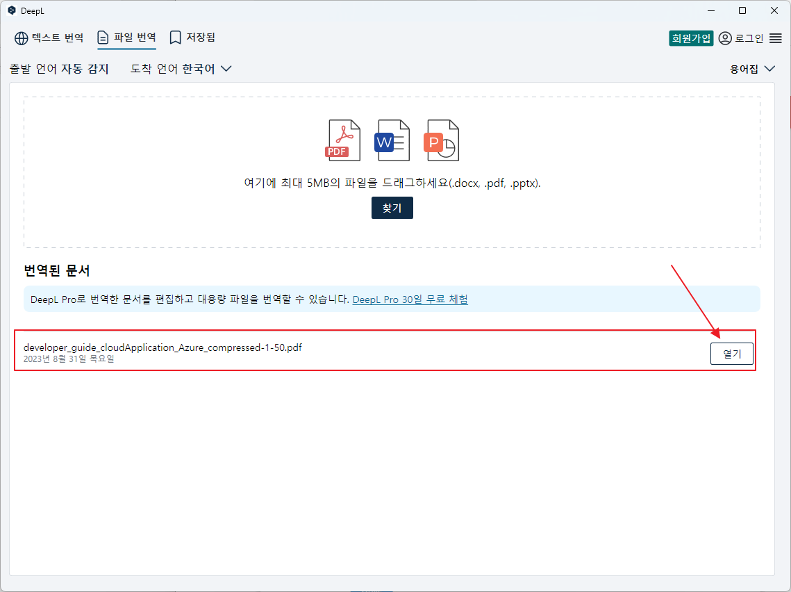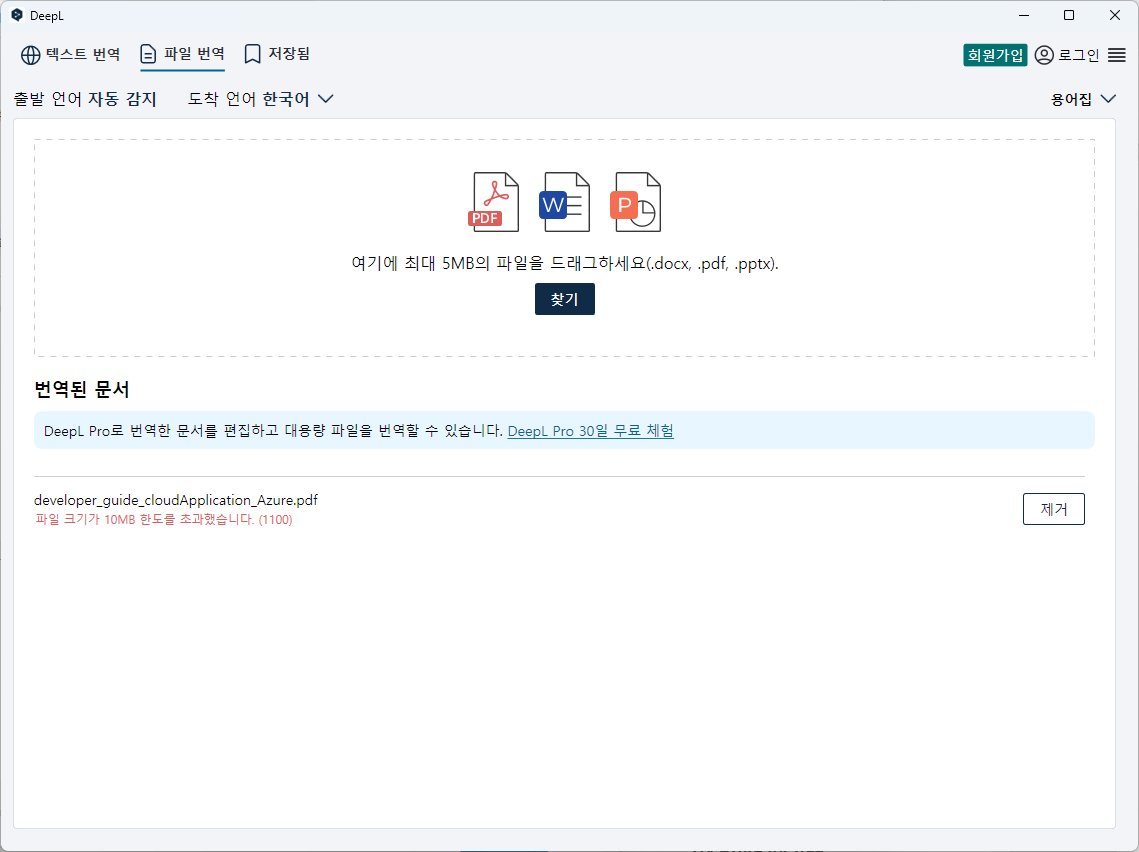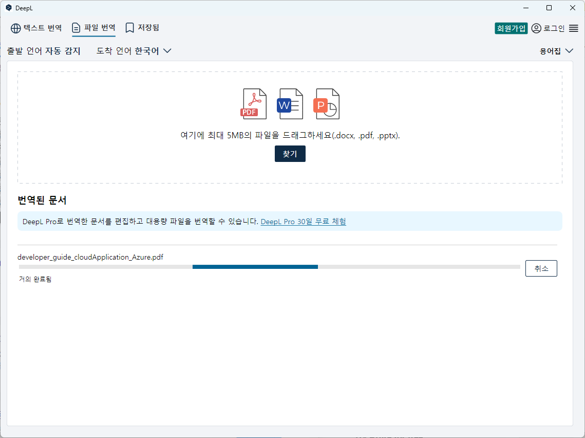 DeepL 번역기는 파일이 최대 5mb 까지 지원하며, pro 구매를 하면 대용량 파일을 번역해서 제공받을 수 있습니다.