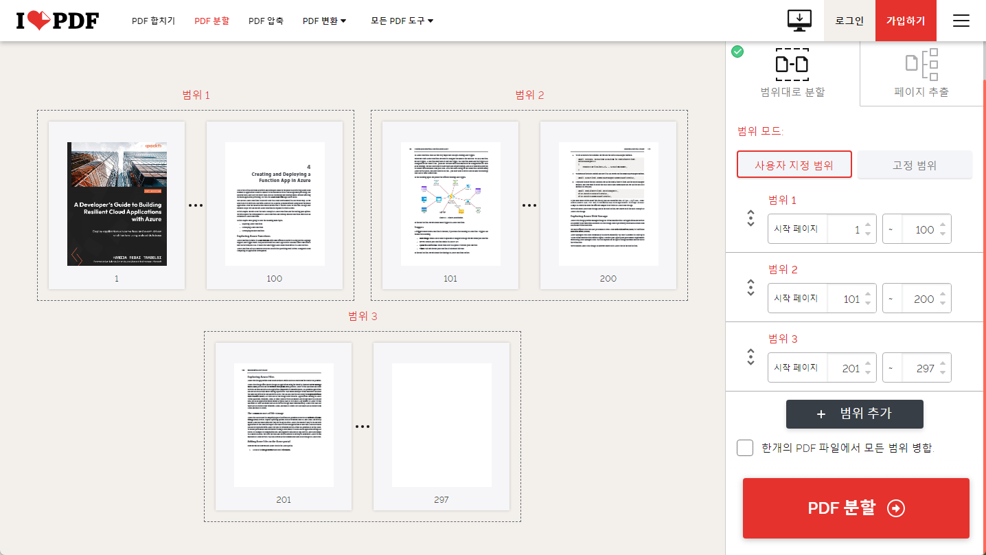 PDF 파일을 업로드하고 나서, 범위모드에서 100 페이지 별로 범위를 나눴습니다. 이제 pdf분할 버튼을 누르면 zip 파일을 제공해 주며 그 안에 3개의 파일이 페이지별로 존재합니다. (예제에서는 100 페이지이지만, 글자수가 많을 경우 50페이지 단위로 분리하세요.)