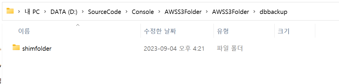 "D:\\SourceCode\\Console\\AWSS3Folder\\AWSS3Folder\\dbbackup" 경로 하단에 shimfolder 폴더가 존재합니다. 해당 폴더 하위에 폴더들이 존재하며, 또 그 하위 폴더들을 가지고 있는 구조입니다.