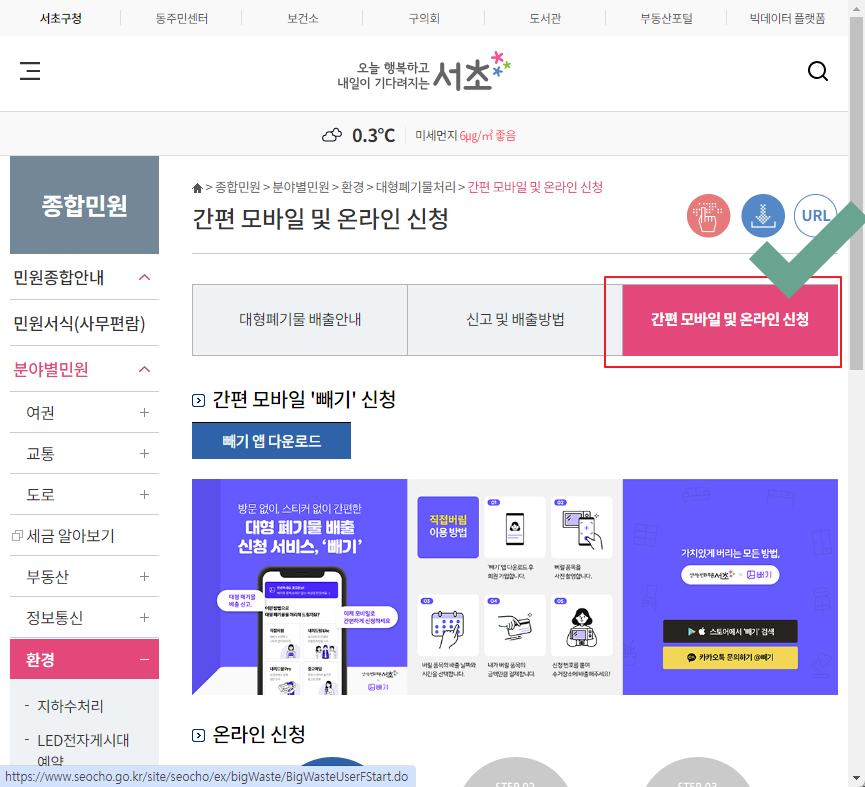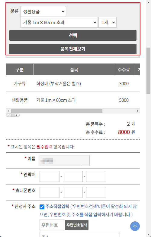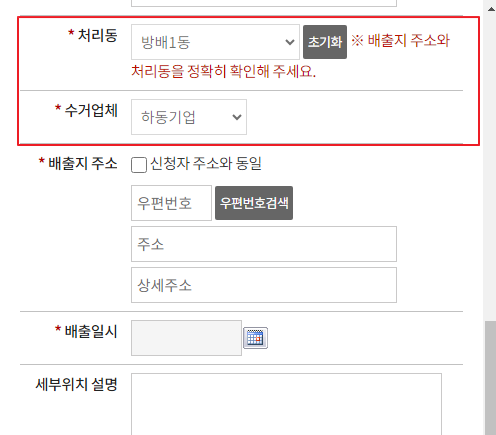 처리동은 현재 거주하시는 주소의 동을 선택하시면, 수거업체가 표기되며, 예를 들어 방배 1동 경우는 하동기업을 선택하시면 됩니다.