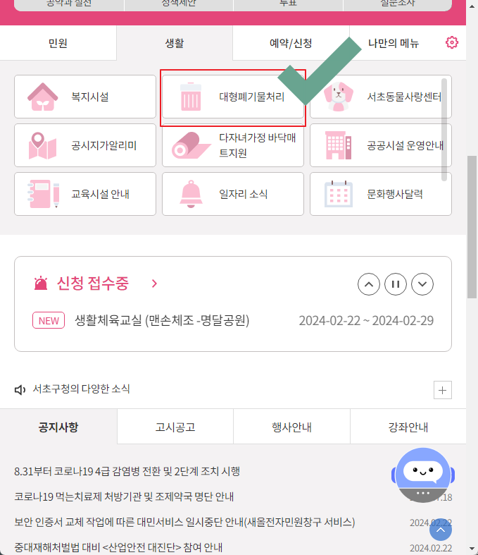 1. 품목에 없을 경우 지역별 수거대행업체에 문의 후 신고 바랍니다. 2. 이사 시에는 미리 전화로 접수해주세요.(임박해서 수거신청을 하시면 혼란이 야기될 수 있습니다.) 3. 종량제 봉투 배출장소이나, 대형 건물 같은 곳에는 지하 2층에 생활 폐기물을 버리기 때문에 차가 들어갈 수 없으니, 현관이나 지하 주차장 들어가는 입구에 배출해주세요. 4. 배출장소 세부위치나 부탁의 말씀을 적어주세요. 5. 공휴일은 대행업체 휴무로 수거하지 않습니다. 참고하시기 바랍니다.