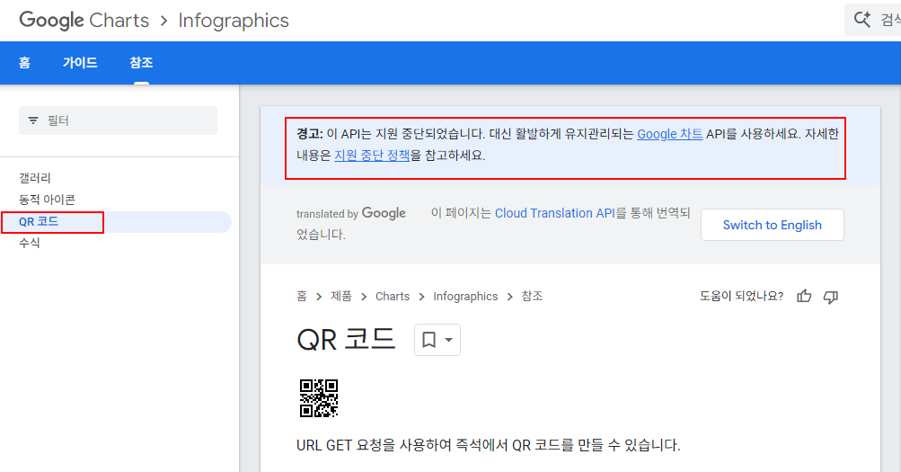QR 코드 생성을 위한 API URL이 더 이상 작동하지 않습니다. 현재 API가 더 이상 사용되지 않는다는 Google의 메시지가 있습니다. https://developers.google.com/chart/infographics/docs/qr_codes 를 참조하세요.