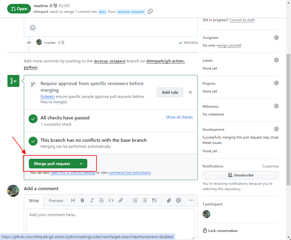 11. 관리자가 내용을 보고 최종 main 에 merge 하고자 한다면, Merge pull request 버튼을 선택한다.