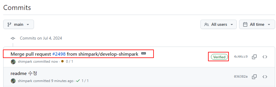13. Commits 내역에 가면, develop-shimpark 의 브랜치에서 요청한 내역을 merge 했다고 되어 있다.