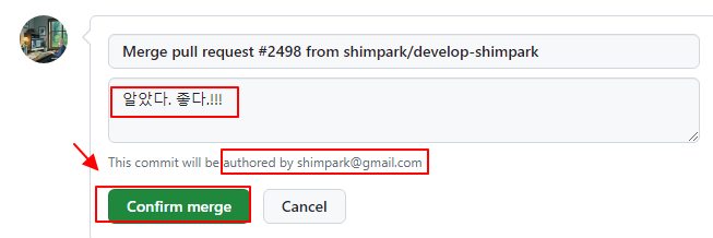 12. 선택 후, 관리자는 commit 내용과 함께 Confirm merge 버튼을 선택하면, 요청한 소스는 병합되어 main 에 반영되어 있다.
